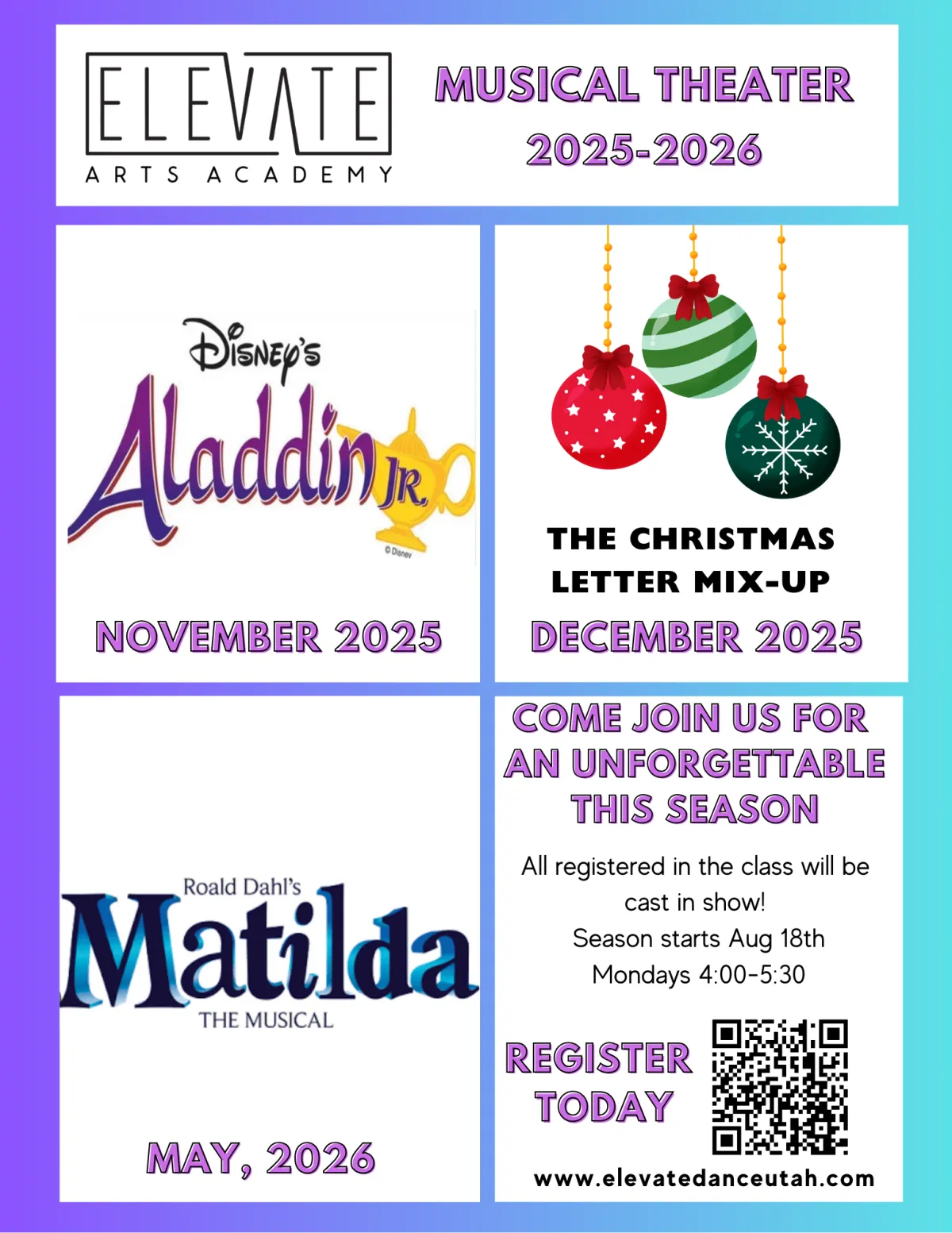 Elevate Musical Theatre Program will inspire students to unleash the performer inside of them. We will rehearse and produce three shows throughout the year. We've chosen "Aladdin Jr., The Christmas Letter Mix-up, and Matilda” for our 2025/2026 season. We welcome both boys and girls for these productions. All who register will be cast!